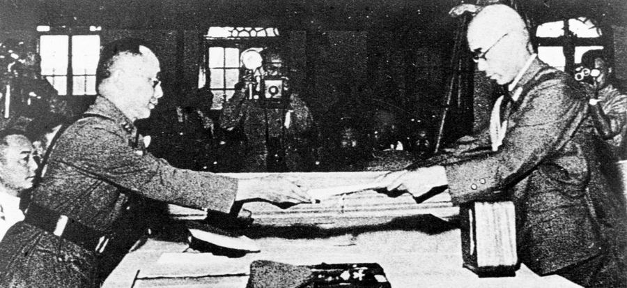1945年9月2日上午,在东京湾的美国“密苏里”号巡洋舰上,举行了日本正式投降的签字仪式。9月9日,中国战区日军投降签字仪式在南京举行。10月25日,台湾地区日军投降仪式在台北举行。